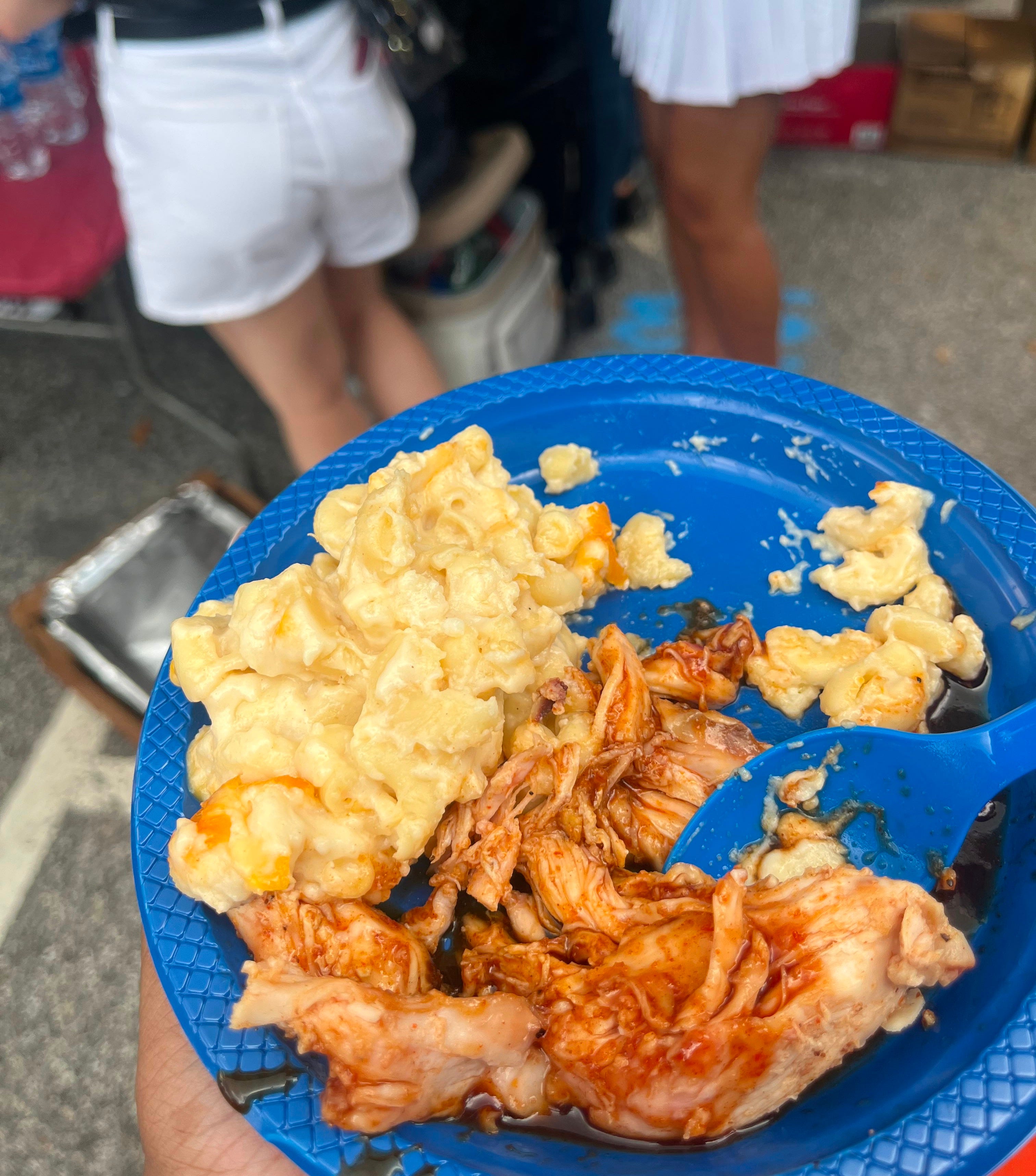 Eventually, we all reunited at the bottom of the hill, where I was rewarded with free food: mac and cheese with pulled chicken, spicy BBQ sauce, and chilled water. Lovely. Despite the chaos, seeing so many familiar faces, old classmates, and friends reminded me why Homecoming is such a special (and chaotic) kind of joy.